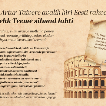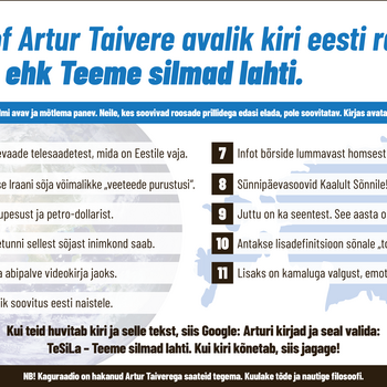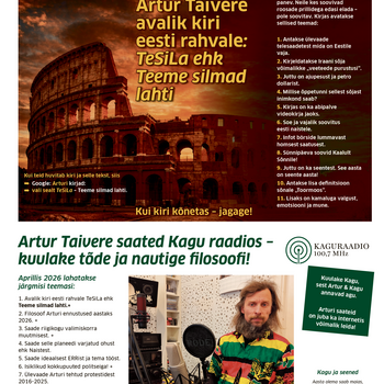 01.04.2026Filosoof Artur Taivere avalik 1. aprilli kiri ERRile - Seitse uut telesaadet! * Tere ERR, Teile kirjutab Artur Taivere – filosoof planeedilt Maa. Kiri on asjalik ja teile hädavajalik! Seega lugege mitu korda ja proovige õigesti aru saada! -